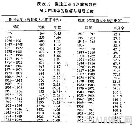 亦即以总样本数(88)减去该走势告一段落的样本数(幅度为55,时间为54),再除以总样本数。(译按:请参考表26.1,"道琼工业指数"的总样本数为88,涨幅在6O%以前结束的走势有55次,持续期限结束干55天的走势有54次。)