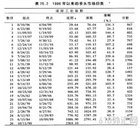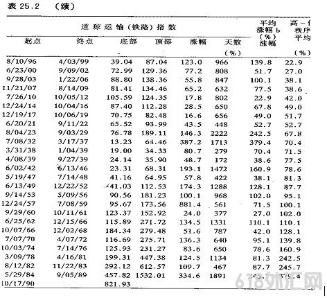 表25.2(多头市场)与表25.3(空头市场)是根据 "道氏理论"整理的市场行情循环资料。为了确实了解表25.2的数据,则需要明白在"道氏理论"中,唯有"工业指数"与"运输指数"都未能继续创高价或低价时,才称为是"顶部"或"底部"。其中一项指数可能较另一指数先创高价,但这并不是顶部,而唯有另一指数未能创高价而产生背离的现象时,这才是顶部。所以,两个指数都突破先前的重要中期低点(顶部)或高点(底部)时,这才是确认。