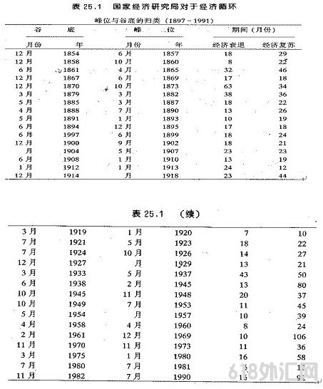 首先是资料:表25.1是根据"国家经济研究局"的资料所列的经济循环峰位与谷底。不幸地,公布的资料仅说明月份而已。为了向外插值,我假定相关的峰位与谷底都发生在月中。