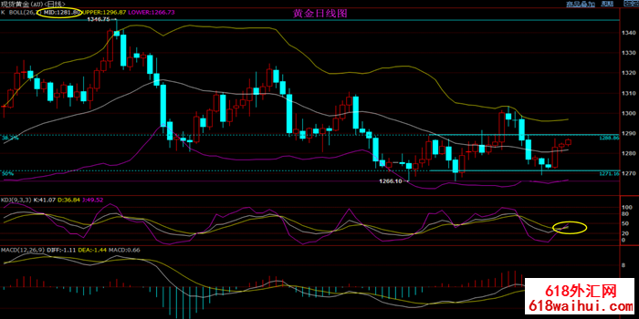 黄金日线来看:震荡;随着二连阳的形成,当前价有效运行短期均线和布林中轨上方,5日均向上延伸至1280构成反向支撑,其它各周期指标逐渐形成多头排列,再配合布林带整体偏上行。KDJ重新结成金叉,MACD也初步结成金叉,金价初步站稳1280关口,短线偏向试探布林线上轨1296附近阻力,100日均线阻力也在该位置附近,日线整体理应为多头占据优势,如果进一步上破,则增加中线看涨信号。若未能进一步上破129附近阻力,则后市金价仍有重回跌势的风险;而且金价目前还受到5月17日高点1288附近阻力压制,