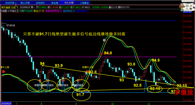 RSI:当RSI向上突破70时,此货币对出现超买现象,现卖出信号;当RSI向下突破30时,此货币对出现超卖现象,现买入信号。