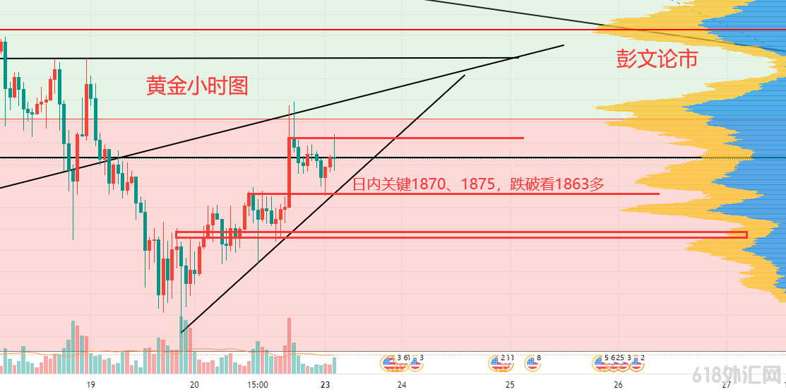 从成交量分布来看,周一重点关注的几个点位:1870、1875,上破1875后的1879。阶梯对应的订单流数据形成共振,今日亚欧盘的交易将主要围绕这几个点位展开。