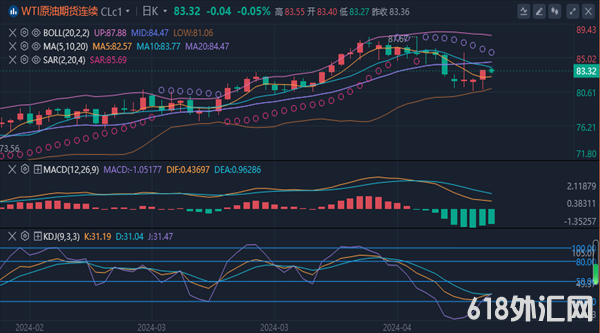 【 原油消息面解】:周二(4月23日)美市盘中,美原油大幅上涨,目前交投于82.3美元/桶附近。布伦特原油期货周一结算价报每桶87.00美元,下跌0.29美元,或0.33%。美国原油期货收跌0.29美元,或0.35%,结算价报每桶82.85美元,盘中最低曾触及80.70美元/桶,为3月27日以来新低。如果供应没有实际受扰,地缘政治风险溢价往往不会持续,并补充称,一些产油国的闲置产能较高,可以弥补任何供应干扰。与此同时,分析发现,一些产量最大的原油等级供应充足,限制了冲突对原油期货的影响。经济方面,通胀再次成为焦点,美联储官员的发言和一系列高于预期的通胀数据在上周促使人们调降降息预期,这意味着美联储将更长时间维持高利率水平,不利于原油需求前景。不过,仍有逢低买盘支撑油价,因为对中东局势的长期担忧仍未完全消除。