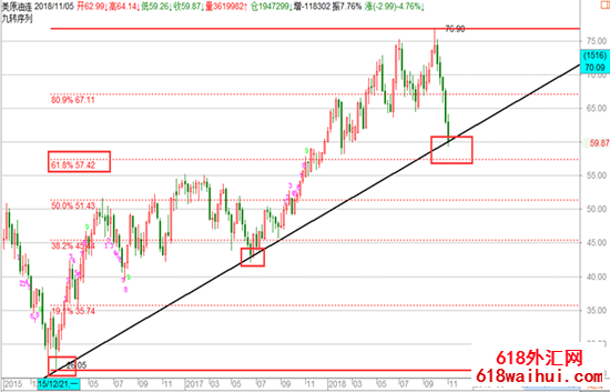 原油:油价的这次跌幅已经超过了23%,在理论上来讲跌幅超过了20%我们就可以定义为行情已经进入熊市阶段,自油价触及76.9以来已经跌了一个多月,这一波跌势来势汹汹,其主要原因在于美国对伊朗的制裁未能如前期那样的强势,其制裁结果我们都知道了,有八个国家是得到了豁免权的,这使市场对于原油供应过剩出现了较为明显的担忧,加上美国EIA库存数据连续七个星期的增长,是原油价格崩盘的主要原因所在,那么本周的原油我们应该怎么操作?