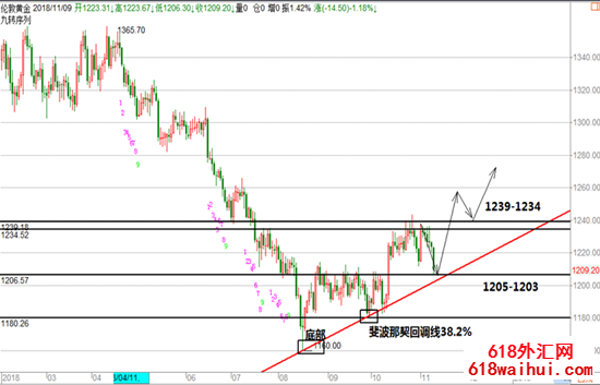 黄金策略:1206-1204触及做多,止损1196,目标看1220-1234-1243(中线)