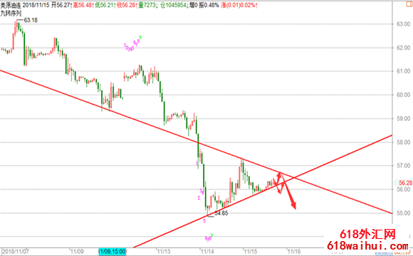 原油:今晚是原油EIA,早间的API数据显示美国至11月9日当周API原油库存录得增加879万桶,远高于预期的301.2万桶,大幅利空油价,数据出来后有50个点的回撤,今天亚盘阶段,原油小幅上涨,我们在56附近盘内给出多单,小盈利出局,目前原油继续沿上升趋势线走三角区间,由于是下行三角,晚间下破趋势线的概率较大,加上API利空,晚间EIA数据预计利空的概率是比较大的,操作思路上我们以高空为主线,上方56.8-57区域触及做空,下方在不破位的情况下可以在56-56.1附近轻仓看反弹一波,这是今天的思路,依然围绕三角来操作,具体的我们以盘内策略为主,需要请大家关注帮主朋友圈的动态。