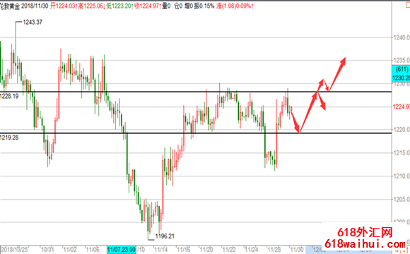 基本面:美国商务部周四公布,美国10月核心PCE物价指数年率录得1.8%,低于预期的1.9%,为自2月份以来的最小增幅;美国10月个人支出月率录得0.6%,大于预期的0.4%,为七个月来的强劲增长,美国上周申请失业金人数录得23.4万人,大于预期的22万人连续三周上涨并升至六个月高位,这可能引发对就业市场可能放缓的担忧。这一数据统计期间有感恩节,假期可能会给数据带来不稳定。周四10年期美国国债收益率延续跌势,自今年9月18日以来首次跌破3%关口。美联储主席鲍威尔发表讲话引发市场关于美联储明年可能暂停加息的猜测,昨天的两则基本面多空因素都有,影响不大,往中后期来分析,由于美联储鲍威尔的鹰转鸽的言论,加上目前美国经济数据有放缓的趋势,特朗普炮轰加息政策,市场普遍认为明年美联储将开始放缓加息频率,这给到黄金多头方面的中长期支撑。