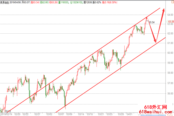 技术面:原油目前的走势跟美股基本是同步的,做股指期货的朋友应该比较清楚,那么在原油接下来的行情当中我们也需要去关注美股的行情,目前美股日线级别已经钝化背离,在下周一二等整理完成,后续预计会有一波较为明显的跳水行情,这是我们需要注意的点,再来看原油,目前在突破刷新高后,原油我们现在不能一味继续看涨,上方的空间目前来看不是很大,如图所示,目前原油四小时级别沿上升趋势通道线在运行,上方63.6-8区域是趋势通道的顶部区域,目前价格离这里空间上已经不大,所以在四小时级别上,周一我们先继续维持看涨思路,等后续触及趋势线顶部后,再来空原油,这是结合美股的走势得到的分析,这轮跳水下方有望到达61-60.8区域,我们可以把握下,这是大方向,短期内,原油下方关注62.6-7区域,周一触及这里多一次,上方关注63.6-8区域,周一不一定能涨到位,但下方做多的位置是确定的,具体我们看幅度,原油周一整体上短线上以回落做多为主,上方触及趋势通道线顶部后做空即可。