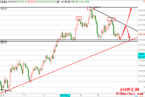 技术面:首先来看日线级别,昨天再收一根长下影十字k,说明目前下方1280的支撑力度是非常强的,连着两天的探底回升已经很能说明问题的,前期两次在1280筑底成功,那么在接下来的行情中黄金是有很大概率形成3底形态,以1280为支撑向上看反弹,上方关注1309-07区域的得失情况,这里的得失我们在之前的文章多次提及是在确认黄金筑底成功后的重要多空分水岭,关乎后市的趋势,上破这里三底成立将继续去冲击1346高点,走1280-1346的大级别区间整理,上不去那么黄金的这轮反抽只是自1325-1280跌势的反抽确认,后市确认完成后预计会走更大级别的回撤,速度及力度会比这轮反弹大的多,继续测试1280底部,甚至跌破去到趋势线底部1270-72区域,这是目前大方向上的分析。