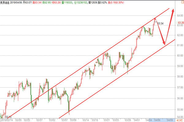 技术面:原油目前的走势跟美股基本是同步的,做股指期货的朋友应该比较清楚,那么在原油接下来的行情当中我们也需要去关注美股的行情,目前美股日线级别已经钝化背离,在下周一二等整理完成,后续预计会有一波较为明显的跳水行情,这是我们需要注意的点,再来看原油,目前在突破刷新高后,原油我们现在不能一味继续看涨,上方的空间目前来看不是很大,如图所示,目前原油四小时级别沿上升趋势通道线在运行,上方63.6-8区域是趋势通道的顶部区域,目前价格离这里空间上已经不大,所以在四小时级别上,周一我们先继续维持看涨思路,等后续触及趋势线顶部后,再来空原油,这是结合美股的走势得到的分析,这轮跳水下方有望到达61-60.8区域,我们可以把握下,这是大方向,短期内,原油下方关注62.6-7区域,周一触及这里多一次,上方关注63.6-8区域,周一不一定能涨到位,但下方做多的位置是确定的,具体我们看幅度,原油周一整体上短线上以回落做多为主,上方触及趋势通道线顶部后做空即可。